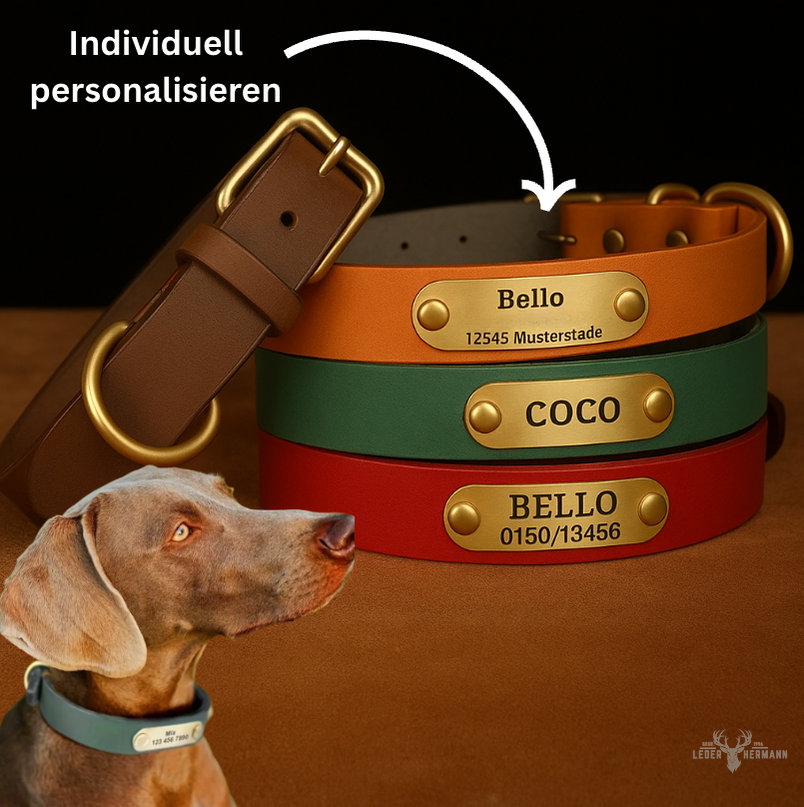 Ein edles, langlebiges Lederhalsband mit persönlicher Gravur, das Ihrem Hund nicht nur Komfort, sondern auch eine individuelle Note verleiht.