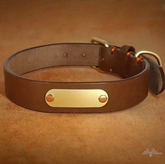 Hunde-Halsband aus Rindsleder mit Gravurplatte – Handgefertigt & individuell personalisierbar
