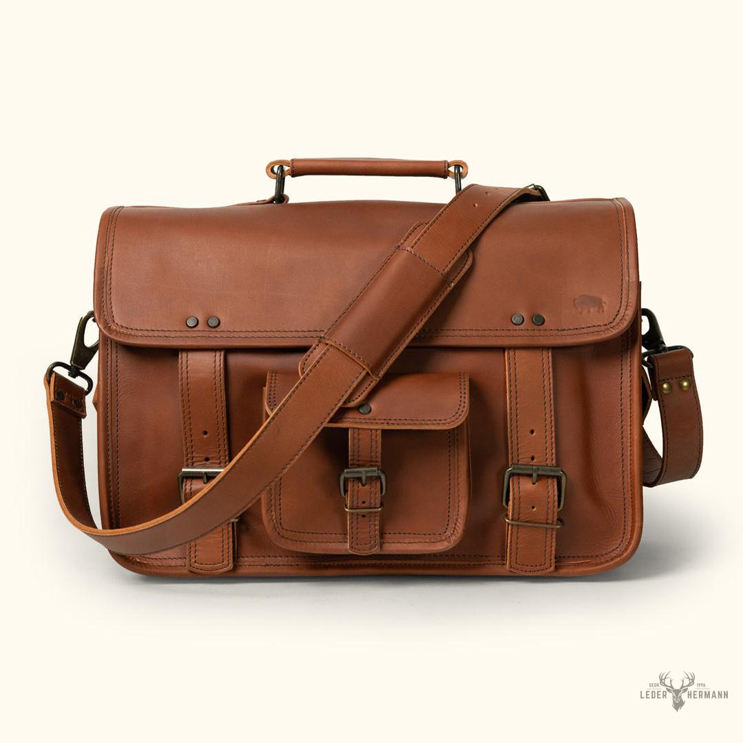Handgefertigt aus vollnarbigem Wasserbüffelleder ist diese Aktentasche stark, zuverlässig und bereit für Arbeit wie Reisen.
