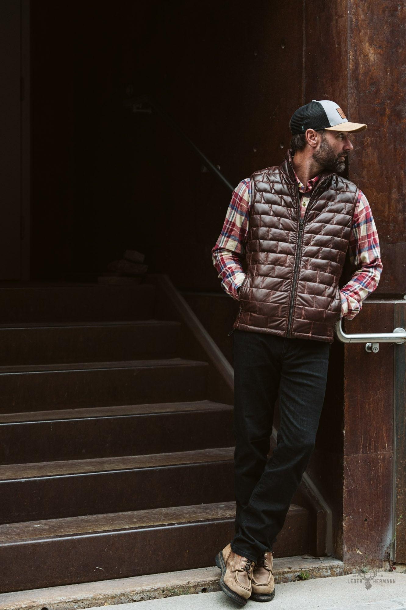 Erleben Sie Abenteuer und Stil mit der Teton-Ledervest—ein hochwertiges Kleidungsstück, inspiriert von der wilden Schönheit der Berge Wyomings.