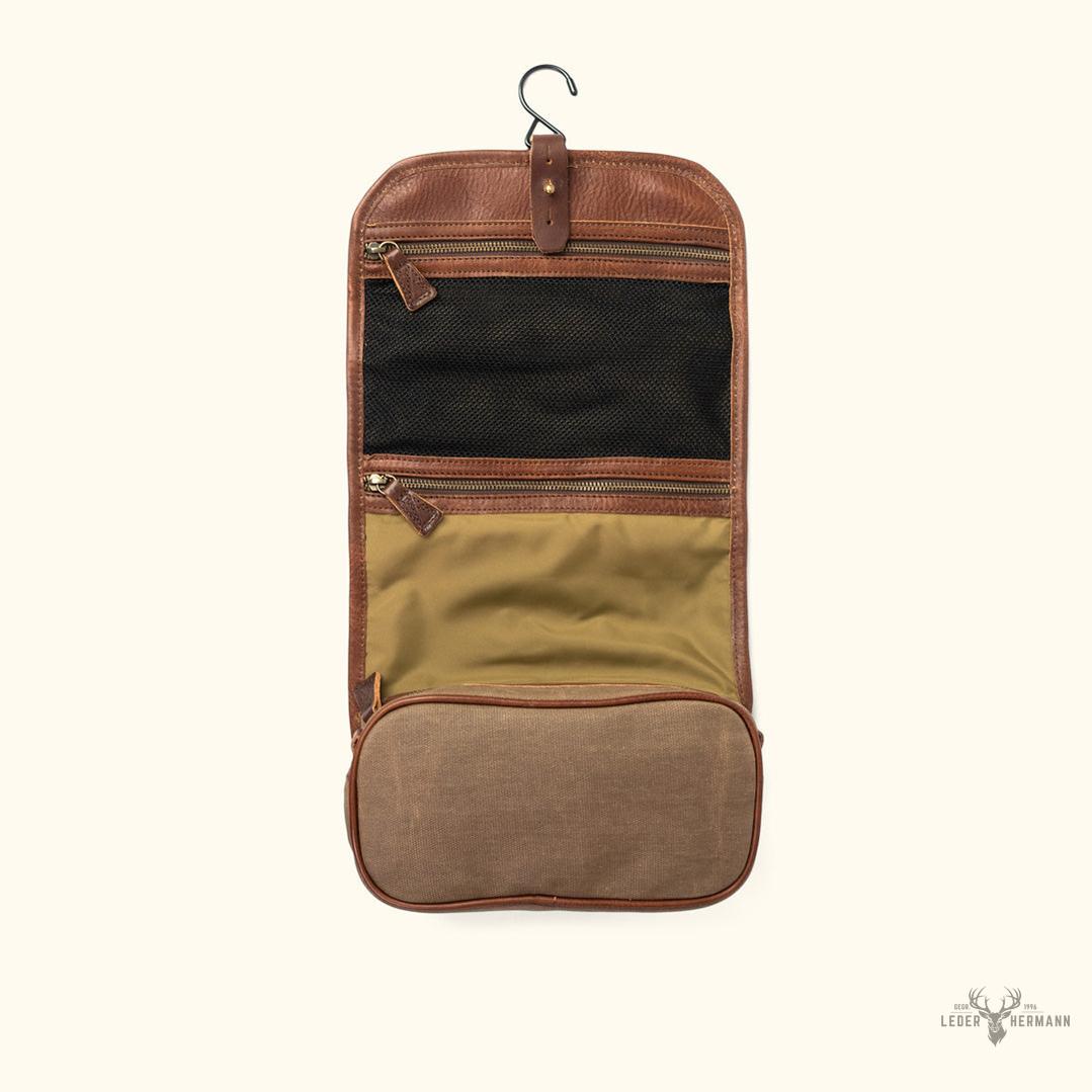 Dakota Wachstuch-Täschchen aus Baumwolle, Einfach aufzuhängen | Kaki-Militärfarbe und braunes Chataigne-Leder